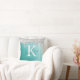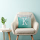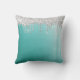 Teal turquoise aqua throw pillow with brushed metallic background and silver glitter drip border personalised with a white monogram initial and handwritten script name in teal. Ideal gift for the one who likes a little sparkle or decorating a room in a trendy cool style. Contact the designer via Zazzle Chat or makeitaboutyoustore@gmail.com if you’d like this design modified, on another product or would like coordinating items.
