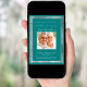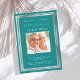 An elegant, modern, simple birthday invitation. A teal, sea green background decorated with faux silver frames. Personalise and add a photo name and details. White text.