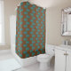 This shower curtain has a mid-century modern design of teal ovals connected by teal lines with light green circles all on a field of brown. Want different colours? Message me.