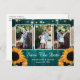 These teal rustic wedding save the date photo postcards featuring burlap, lace and barn wood background with sunflowers are ideal for a teal rustic wedding party inspired by sunflowers.