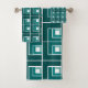 This towel set has a geometric design made from Ls in shades of teal laid in different directions repeating across the design.