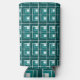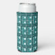 This seltzer can cooler has a geometric design made from Ls in shades of teal laid in different directions repeating across the design.