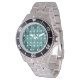 This men's watch has a geometric design made from Ls in shades of teal laid in different directions repeating across the design.