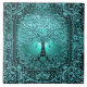 A beautiful ornate design with a teal tree of life with an ornate frame and a heart at the roots. There is a night sky background.