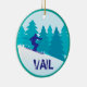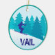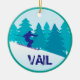 What better place to spend a Christmas holiday than on the ski slopes of Vail, Colorado? Even if you can't be there in person, this keepsake ornament can take you there in spirit. It features a circle image in teal and blue of a silhouette snow skier in front of pine trees on a snowy mountain. The bottom has distressed text in blue that says VAIL. The back side has your custom text in white on a matching teal background. *Clip art used in this design is copyrighted by Encore Software, Inc., which permits use to its licensors. All rights reserved.
