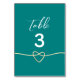 Simple, minimalist, elegant, modern handwritten calligraphy teal table number for weddings with gold rope heart.