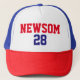 Simple red white and blue sports inspired campaign shirt with name and number shows that when it comes to the game of politics, you play for Team Gavin Newsom to win the 2028 United States Presidential election. Some are saying this is a beautiful hat, perhaps the most beautiful hat in the history of hats.