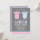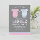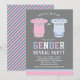 Pick a team with this charming gender reveal party invitation featuring light pink and light blue baby outfits on a soft grey background. Playful "Gender Reveal Party" lettering in a sporty team-inspired style is framed by coordinating pastel stripe and polka dot accents. The grey backdrop pairs beautifully with the gentle pastel tones for a modern, polished look. All text is fully customisable.