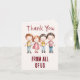 Say a sincere "Thank You From All of Us" with this charming, double-folded greeting card. The cover features an adorable hand-drawn watercolor illustration of four happy children holding hands, making it ideal for group or team messages. This sweet, versatile card is perfect for showing appreciation from a classroom, office team, family, or group of friends after any event, gift, or kindness. Since the interior is blank, you have plenty of space for everyone to sign or to write one unified, customized message of thanks.