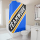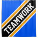 This cool, sporty design features athletic TEAMWORK text inside highlighted wide diagonal black, white, and golden yellow racing stripes against bright blue background.