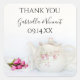 Customise these elegant Teapot and Pink Roses Wedding Thank You Favour Tag Stickers with the personal names of the bride and groom and specific high tea marriage reception or bridal shower date. These classy custom garden tea party wedding favour tags feature a floral photograph of a flowery tea pot with pink rose flowers and white satin.