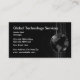 This unique and powerful technology themed business card is designed with a world globe and abstract background in black and grey. The design was created for a computer related business or service related to security, communications, or business services.
