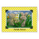 Teddy bear and bunny in daffodil garden with yellow polka dot frame.
