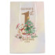 Adorable watercolor illustration celebrating a baby’s first Christmas. The design features a large brown “1st” with the word “Christmas” written below in a matching script. A cute teddy bear wearing a Santa hat and red scarf stands beside a decorated Christmas tree adorned with red and gold ornaments, topped with a golden star. Wrapped presents with red ribbons and festive greenery complete the cosy holiday scene. A warm and charming artwork full of Christmas spirit.
