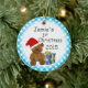 Baby's first Christmas ornament with image of cute teddy bear wearing Santa hat with present and a blue plaid background.