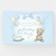 A birthday image with a blue background, featuring a bear with a blue bow around its neck, a white rocking horse with blue dots, and blue and beige balloons