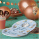 This whimsical baby shower plate features astronaut teddy bears, space crafts, stars, planets and a telescope. It says "We're Over the Moon" in a curve around the moon and then below is a template for you to put just the Mom to Be's name or Mom and Dad's to be name with "Baby Shower". These make the cutest plates for a baby shower luncheon or snacks and treats. Be sure to check out the entire collection to have a completely coordinated baby shower!