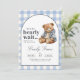 This charming baby shower invitation features a sweet watercolor teddy bear dressed in a cosy hoodie, set against a classic blue gingham background. Perfect for a boy's baby shower, this design combines rustic charm with a soft, playful vibe.