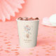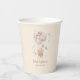 This papercup features an adorable teddy bear holding balloons. Around the teddy bear there are small stars adding a whimsical and sweet touch.