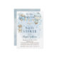 Cute Baby Shower design featuring a teddy bear with a blue bow-tie hanging on to a bunch of balloons on one side with an air balloon carrying a floral bouquet on the right side. Bunting flags hang between the two balloons supporting the words "We Can Bearly Wait!" Clouds and stars on a blue watercolor background round out the design. Back features a watercolor sky look background with white and beige polka dots. Composite design by Holiday Hearts Designs.