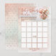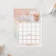 Cute Baby Shower "Bingo" game design featuring a teddy bear with a pink bow-tie in a basket tied to a bunch of pink and light teal balloons adorned with pink flowers. A rose pink and light teal watercolor background with white fading in round out the design. Back features a repeat of the same background with two-tone pink polka dots. Available in print and/or download options. Composite design by Holiday Hearts Designs.