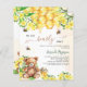 A stylish white and golden watercolored background. Decorated with bees, a teddy bear, melting honey and honeycomb with yellow florals, flowers and a honey jar. With the text: We can bearly wait. Personalise and add the name of the mum to bee. Gender neutral.