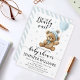 Cute brown blue teddy bear with balloon invitation for baby shower.