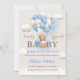 This baby shower invitation features a cute teddy bear sitting in a basket suspended by blue and cream-coloured balloons, resembling a hot air balloon. The word "BABY" is prominently displayed in large letters below the bear. The background is soft with fluffy clouds, twinkling stars, and a smiling star. The design exudes warmth and charm, ideal for a baby shower.