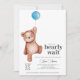 A baby shower "we can bearly wait" invitation featuring a teddy bear and blue balloon for a baby boy. Matching items available in the Teddy Bear Baby Shower Theme collection.