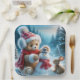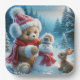 A brown teddy bear in a hat, earmuffs, and red scarf builds a small snowman in a winter woods while a curious rabbit watches.