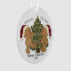 Cute, vintage, teddy bear Christmas tree trimming on white background. Teddy bears wearing Santa Claus red hats trimming a traditional Christmas tree. Grandma, Grandpa, Merry Christmas and year templates on both sides created for you.