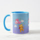 A Teddy Bear close up with Heart Balloon's that's bright and colourful that's on a Coffee Mug (Cup).