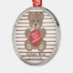 Celebrate baby's first holiday with this adorable teddy bear, ceramic ornament. Set against a candy cane striped background is this cuddly brown bear. The bear is holding red ornament that reads "Baby's First Christmas". You can customize this text. Underneath the bear is an area for a name and a date.