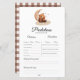 This teddy bear gender-neutral prediction game card features a cute teddy bear nestled among soft clouds, in soothing shades of beige and brown. Guests can fill out their predictions for the baby’s arrival, such as birth date, weight, and name, adding a fun and interactive element to your baby shower. Perfect for a neutral or woodland-themed celebration, this game card creates a whimsical and memorable experience for your guests.