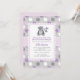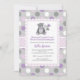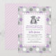 This cute baby girl shower invitation features a sweet teddy bear holding balloons with a polka dot background in purple and grey.