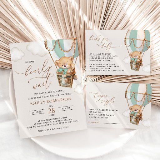Invite friends and family in style and set the tone for your special day with this charming baby shower invitation. Design features teddy bear in green hot air balloon on beige background.