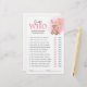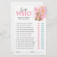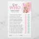 A girl teddy bear baby shower game featuring a simple plain white background, a watercolor bear, pink balloon, gold stars & a babies bottle, and a "guess who, mummy or daddy" template that is easy to personalise.