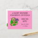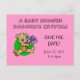 Save the date for a baby shower. Cute teddy bear holding a purple daisy with a pink background