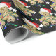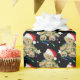 Cute brown teddy bear tangled in Christmas lights on black background with white stars.