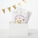 A sweet little teddy bear surrounded by pink and purple flowers watercolor illustration girl's baby shower personalised treat favour bag.