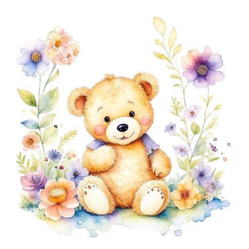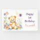 Personalised 1st birthday banner. A sweet little teddy bear surrounded by pink and purple flowers watercolor illustration girl's birthday party.
