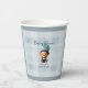 Create unique baby shower paper cups featuring blue colours, and a casual chic teddy bear with gingham and balloons. The front and back includes the event name and guest of honour that you can edit for your needs. Bear Jean Baby design. Use the template to create special, personalised paper cups for your baby shower.