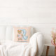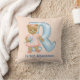 Cute nursery pillow or child's room pillow has soft pastel peach background that you can change to another colour if you click the customise button and then look on the right for the small edit link. Front of pillow features a girl teddy bear with a hair bow and bouquet of flowers next to a pastel aqua blue heart pattern letter R with text saying R is for Rhiannon. Text area is ready for you to change to your child's name.