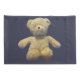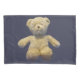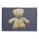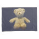 A cute fluffy brown stuffed teddy bear on blue pillow cases. Great to go with the other teddy bear items for a child's room.