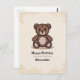 A birthday postcard with an illustration of a teddy bear against a stained background and customisable texts with a curvy line: perfect to send to a kid or to accompany a gift!