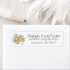 Christmas return address label with a Christmas scene of presents and toys - a teddy bear, plane and candy cane wait next to presents waiting to be unwrapped. Blue border. Personalise with your name and address. Matching Christmas card available.