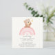 This adorable baby shower invitation features a charming teddy bear sitting on a colourful pink rainbow, creating a whimsical and joyful design perfect for celebrating the arrival of a sweet new baby. The soft pastel colours and sweet imagery make this invitation a delightful choice for a baby shower event.