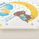 Cute and colourful baby boy birth stats with an adorable teddy bear cartoon with a blue bow ribbon sitting on a sleeping moon holding balloons in yellow and blue and colourful stars.
