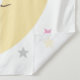 Cute and colourful baby girl birth stats with an adorable teddy bear cartoon with a pink bow ribbon sitting on a sleeping moon holding balloons in pale yellow and pink and colourful stars.