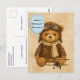 The front of this Aviation themed postcard features a cute, brown Teddy Bear wearing a pilot helmet and goggles over his head, a jacket and scarf around his neck. On his hand he is seen holding a blue balloon with a custom birthday greeting. Customise it with your child's name or add their age! Next to his foot is an image of a classic vintage aeroplane. On the back, personalise it with the sender's name, address, and custom birthday message or use ours. Great for family, friends, flight instructor, or co-workers to celebrate a birthday for a pilot or aviation lover.